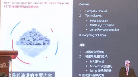 Andreas Hunold,Technical Sales Manager at Gneuss Kunststofftechnic GmbH, brought up the company's new recycling technologies for efficient circular recycling of PET fiber waste to high quality fibers.