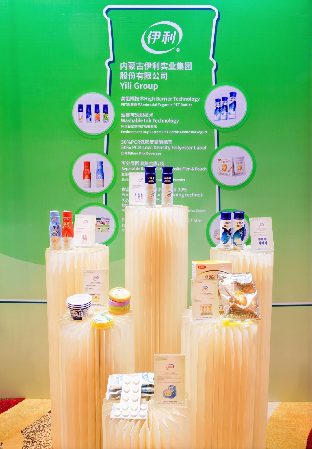 ▲50%PCR低密度聚酯标签-口味奶,微发泡技术-5G酸奶、甄稀冰淇淋,PET阻水材料-牛奶片泡罩包装,高阻隔技术-PET瓶安慕希,可分层回收复合膜/袋-金领冠婴儿奶粉,油墨可洗脱技术-环境日定制PET瓶安慕希